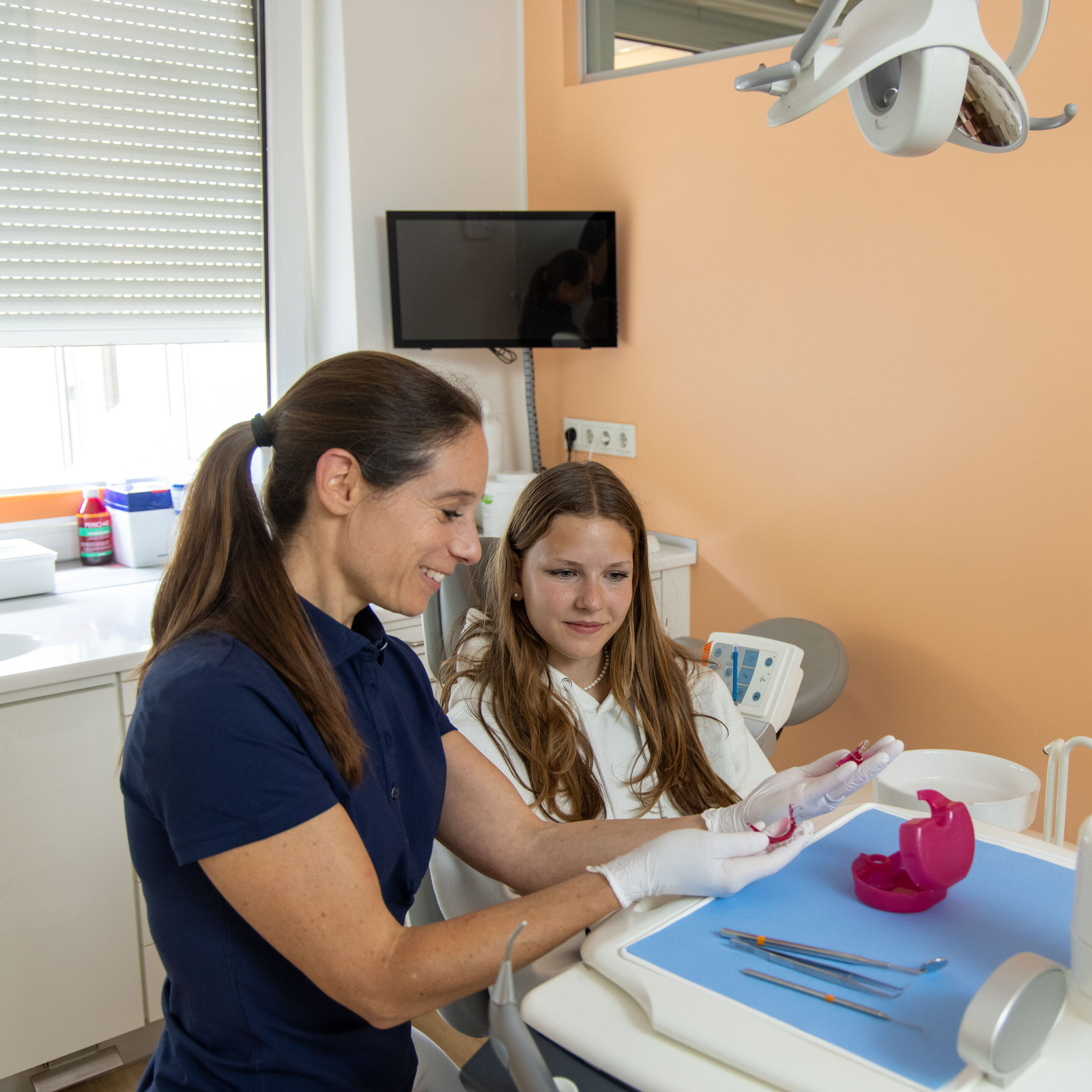 Die Zeit des Zahnwechsels vom Milchgebiss zum bleibenden Gebiss geht mit einem intensiven körperlichen Wachstum einher. Diese Entwicklungsphase des Gebisses bietet optimale Voraussetzungen für Zahnbewegungen und die Möglichkeit einer dauerhaften Harmonisierung der Position der Gesichtsknochen und Weichteilstrukturen. Mit herausnehmbaren und / oder festsitzenden Zahnspangen werden also nicht nur schiefe Zähne begradigt, sondern es wird auch - im Rahmen des Machbaren - die Gesichtsästhetik positiv beeinflusst, wie z. B. ein fliehendes Kinn korrigiert.